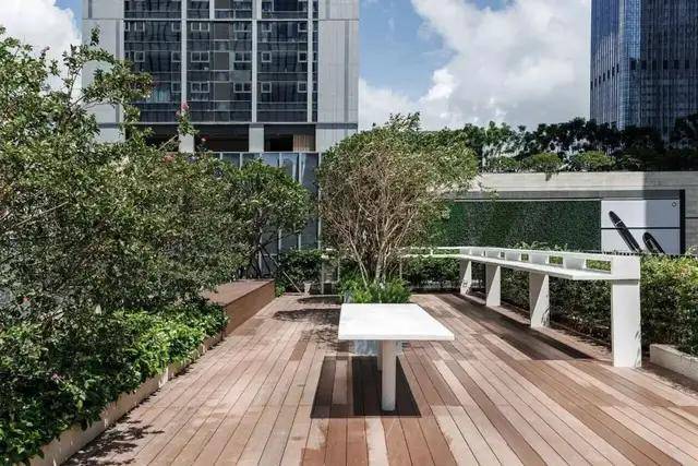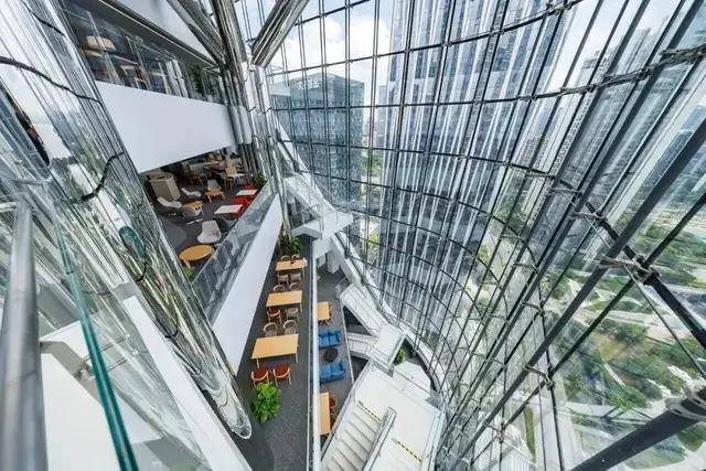 四层员工食堂与屋顶花园相连,将高空区域打造成一片可供休憩和交流的绿色场所,兼顾办公与生活需求。