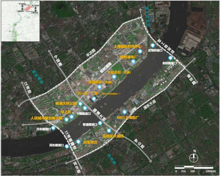 在杨浦滨江版九宫格中,主要是高端住宅+1块风貌商办,而紧邻九宫格的四至方位可以看到: