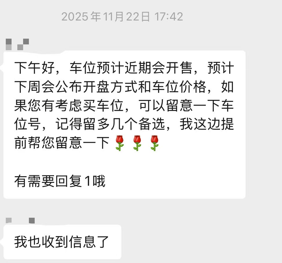 时间回到2025年11月22日,黄埔新城观澄组团的一位业主,突然在群里跟大家说,她收到开发商要卖车位的消息了。