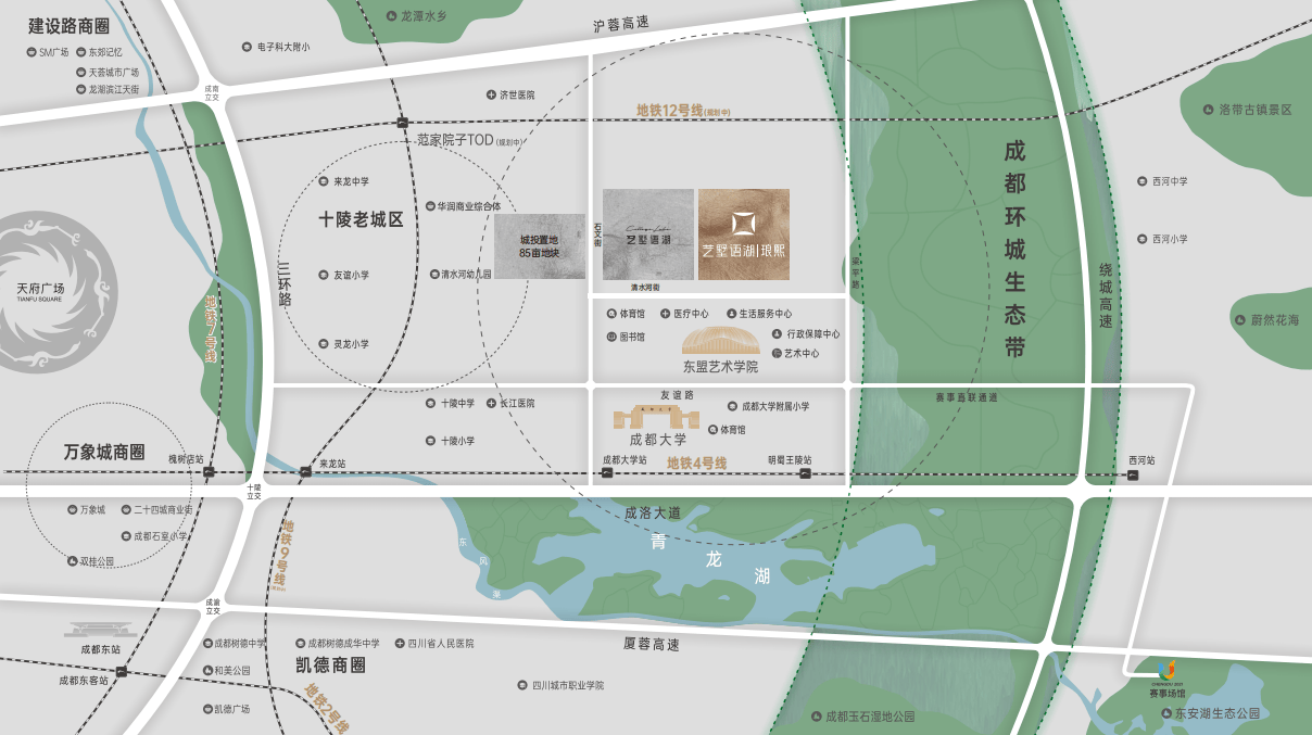 公园湖区:约30000亩青龙湖湿地公园、成都大学嘤鸣湖、东盟艺术学院内生态湖、环城生态带、缤纷生态花海等