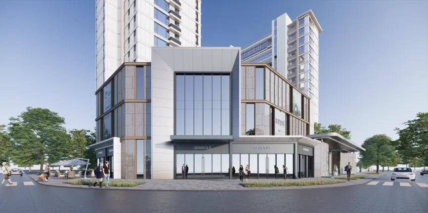 首层基座采用人造石材+铝板等装饰材料,增强建筑整体感和精致度;顶层外挑飘板使建筑立面更加清晰,层次感更丰富。