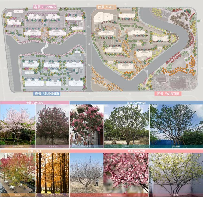 整个小区的景观规划为:春、夏、秋、冬四大主题,不仅在软硬景设计上贴合主题,还通过各季节代表性的植物进行补充、完善。不仅能够“移步易景”,甚至还能感受到“时移境迁”的别致体验。