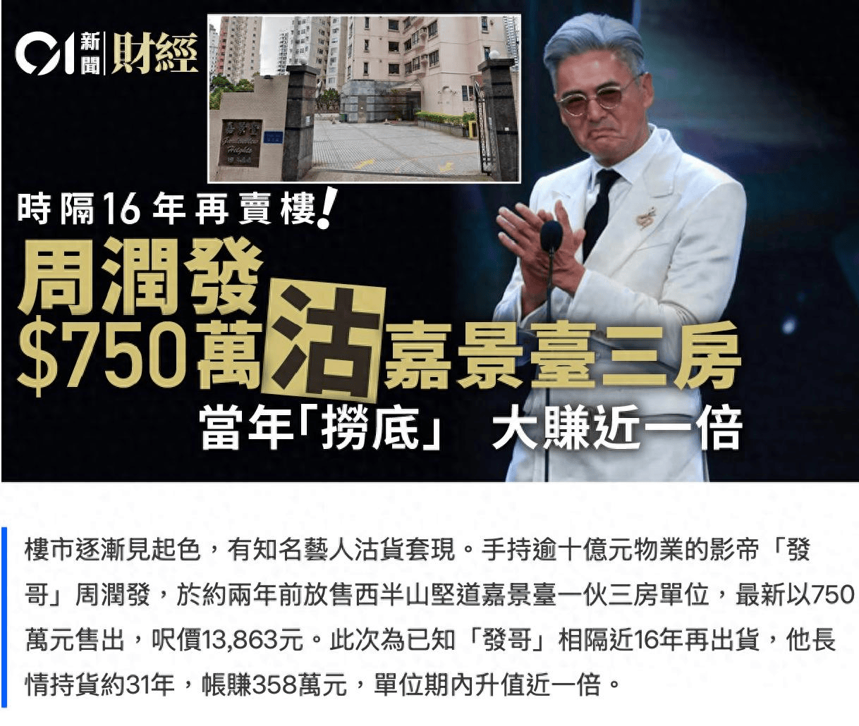时隔 16 年,周润发终于再次成交房产。西半山一套仅 50 平米的小户型,最终以 750 万成功卖出。这套 1995 年 392 万购入的房子,持有整整 31 年,即便大幅降价成交,依旧净赚 358 万。房子面积小、受众广、门槛低,在低迷楼市里远比豪宅好出手,降价 149 万后快速成交,也贴合当下香港刚需好走、豪宅滞销的现状。